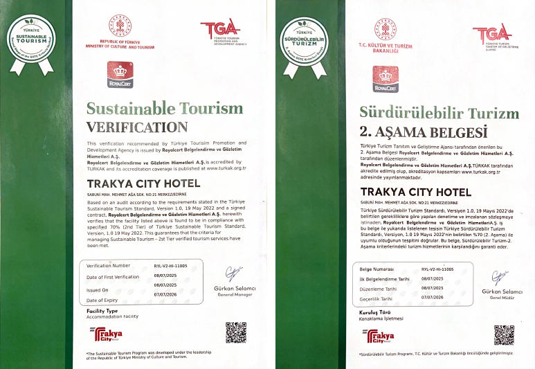 Trakya City Hotel olarak, konaklama deneyiminizi doğaya ve kültürel mirasımıza duyduğumuz saygıyla birleştiriyoruz. Türkiye Sürdürülebilir Turizm Programı kapsamında aldığımız 2. Aşama Belgesi ile sadece bir otel değil, yarınları düşünen çevre dostu bir yaşam alanı sunuyoruz.